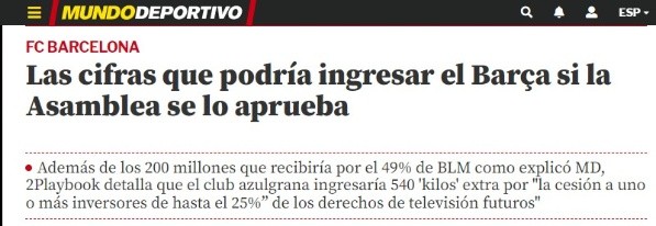 300 millones se recibirían por el 49% de BLM (Barça Licensing & Merchandising S.L.U) y 2Playbook deja en claro que el club azulgrana ingresaría 540 ‘kilos’ extra por la inversión de capital por hasta el 25% de los derechos de TV del club (CVC pica en punta). Los socios tendrán la decisión de apostar o no por un camino efectivo a corto plazo para fichar pero que condiciona el futuro del Barcelona a empresas que poco o nada tienen que ver con el fútbol. ¿Firmas?