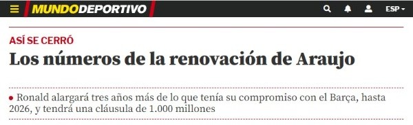 Mundo Deportivo asegura que Ronald Araújo extenderá su contrato con el equipo culé del 2023 hasta el 2026. Si bien no parece una prolongación demasiado importante, si dará suficiente margen de tiempo a un Barcelona que para dicha fecha espera poder recuperar buena parte de su económica con e objetivo de ofrecerle un contrato en condiciones al charrúa.