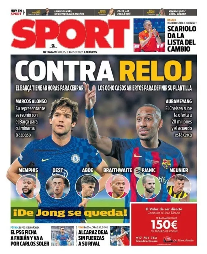 En cuanto al apartado de salidas, se espera que nombre como Memphis Depay, Pierre Emerick Aubamenyang (Chelsea), Sergiño Dest, Miralem Pjanic y Martin Braithwaite traigan novedades en una jornada donde igualmente Abde (Barça B) pondrá rumbo a Osasuna. Barcelona no descansa en un final de mercado con siete frentes abiertos y donde Marcos Alonso ya cuenta como refuerzo para Xavi Hernández. Conseguir hasta 35 millones de euros, el objetivo de Joan Laporta. ¿Héctor Bellerín? Frio de momento para Sport.