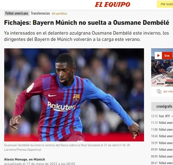 L’Equipe apunta que Bayern Múnich moverá ficha Dembelé en las próximas horas con un contrato por cuatro temporadas donde el Mosquito gane 18 millones de euros cada 12 meses. La venganza contra Barcelona por el futuro de Robert Lewandowski tiene nombre propio y será el jugador que más hace suspirar a Xavi Hernández.