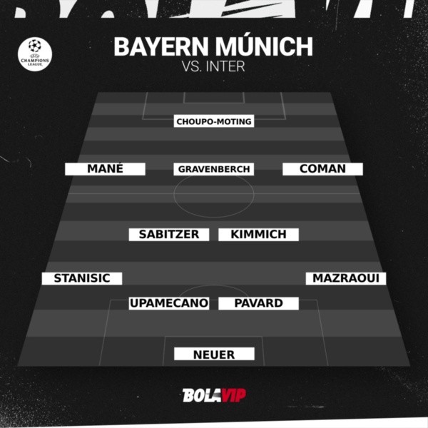 Ulreich; Mazraoui,Pavard, Upamecano, Stanisic; Sabitzer, Kimmich; Coman,Gravenberch, Mané; y Choupo-Moting
