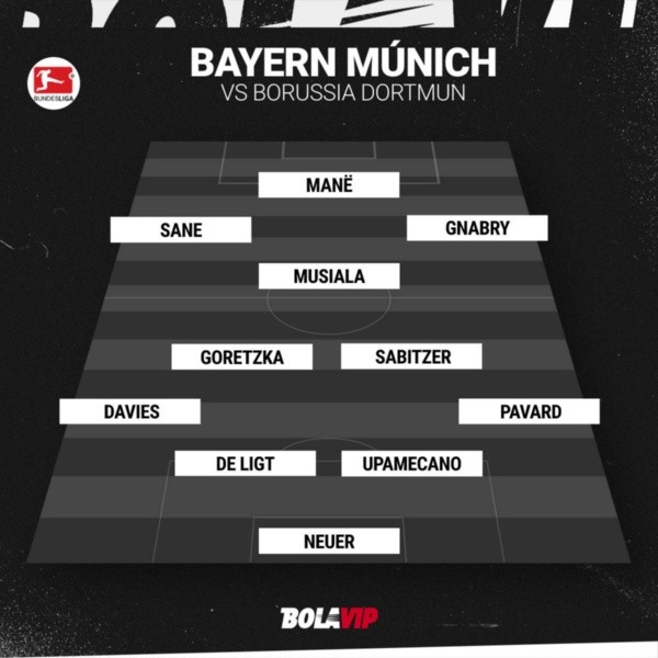 Manuel Neuer; Benjamin Pavard, Dayot Upamecano, Matthijs de Ligt, Alphonso Davies; Leon Goretzka, Marcel Sabitzer; Leroy Sane, Jamal Musiala, Sadio Mane y Serge Gnabry.