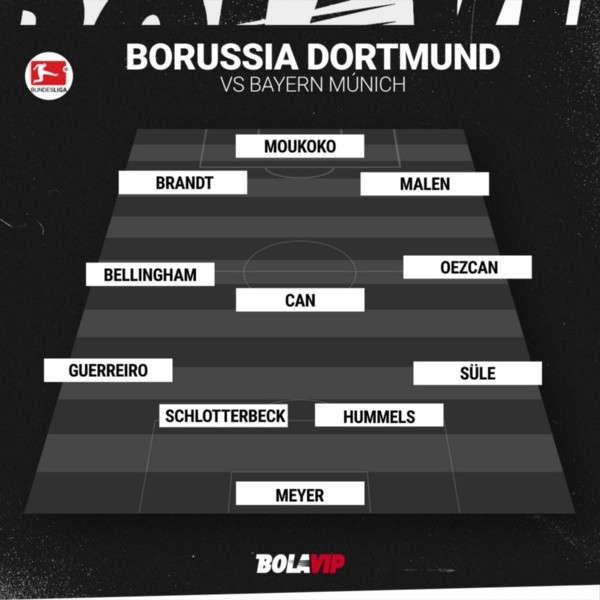 Alexander Meyer: Niklas Süle, Matts Hummels, Nico Schlotterbeck, Raphael Guerreiro; Emre Can, Salih Ozcan, Jude Bellingham; Julian Brandt, Donyell Malen y Youssoufa Moukoko.