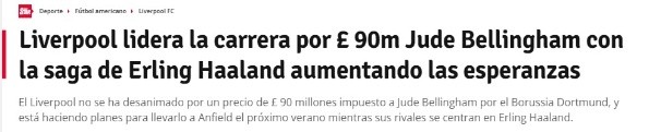 Daily Star asegura que Liverpool quiere aprovecharse de la guerra que vivirá la Premier League por Erling Haaland. Los equipos de Manchester enfocarán sus recursos y tiempo en la contratación del noruego, lo que liberará al conjunto de Jürgen Klopp en la carrera por quedarse con otra perla del Signal Iduana Park. Jude Bellingham es el apuntado como el principal deseo de los Reds para el verano.