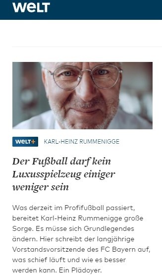 Karl Heinz Rummenigge, ex presidente del Bayern Múnich pasó por micrófonos del Wel Am Sontag para analizar la dura situación económica que vive el fútbol gracias a la pandemia. El histórico jugador y dirigente de los Bávaros se mostró preocupado por las diferencias y favoritismo del ente regidor del balompié europeo para quien con la ayuda de estados como Qatar o Emiratos Árabes invierten sin control en el viejo continente. Propone una revolución.