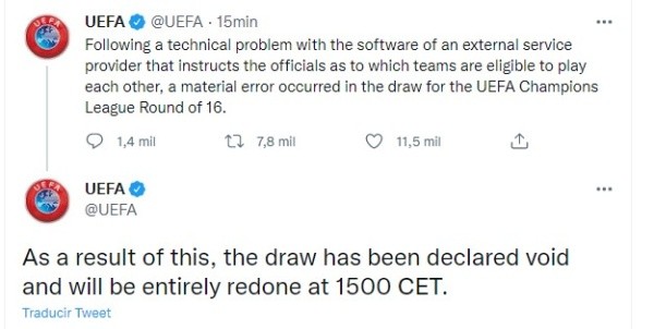 “Tras un problema técnico con el software de un proveedor de servicios externo que instruye a los árbitros sobre qué equipos son elegibles para jugar entre sí, se produjo un error material en el sorteo de los octavos de final de la UEFA Champions League”, empezaban desde el ente para explicar lo ocurrido desde las 12:00 en Nyon.