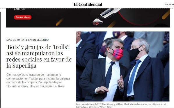 El medio apunta que se han creado más de 7000 cuentas de Twitter para inclinar la balanza en redes sociales a favor de Florentino Pérez, la Superliga y pastorear la opinión del público general en contra del máximo dirigente de LaLiga Javier Tebas y del de la UEFA Aleksander Ceferin.