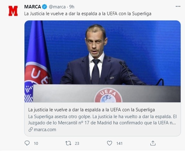 La medida supone un nuevo golpe de la Superliga a UEFA, quien sabe que de momento la causa deberá permanecer en la justicia ordinaria y por ende, podría llegar a la Unión Europea. Varios medios cómo MARCA aseguran que es esta justamente la intención de Florentino Pérez, quien buscará que en Bruselas se miren a fondo las cuentas y acciones del ente. La batalla por el control del fútbol europeo está lejos de terminarse.