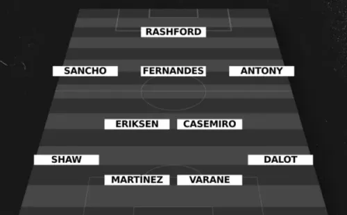 David De Gea; Diogo Dalot, Raphael Varane, Lisandro Martinez, Luke Shaw; Casemiro, Eriksen; Antony, Bruno Fernandes, Jadon Sancho; Marcus Rashford.