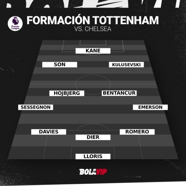 Hugo Lloris; Cristian Romero, Eric Dier, Ben Davies; Emerson, Rodrigo Bentancur, Pierre-Emile Hojbjerg, Ryan Sessegnon; Dejan Kulusevski, Harry Kane y Heung-Min Son.