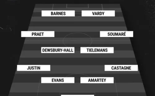 El elenco visitante sale con: Danny Ward; Thimothy Castagne, Daniel Amartey, Jonny Evans, James Justin; Kiernan Dewsbury-Hall, Dennis Praet, BoubakarySoumaré,Youri Tielemans;Harvey Barnesy Jamie Vardy.