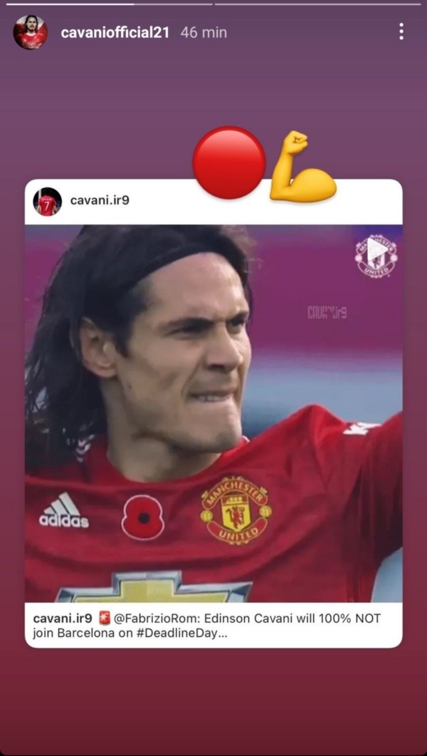 Finalmente, se confirmó que Cavani no llegará al Barça y se quedará a pelear minutos en el United. El uruguayo más tarde publicó una historia en su cuenta de Instagram resaltando su compromiso con los Diablos Rojos, con un guiño a Fabrizio Romano, el periodista que anunció que se quedaría, junto a los colores de su club.