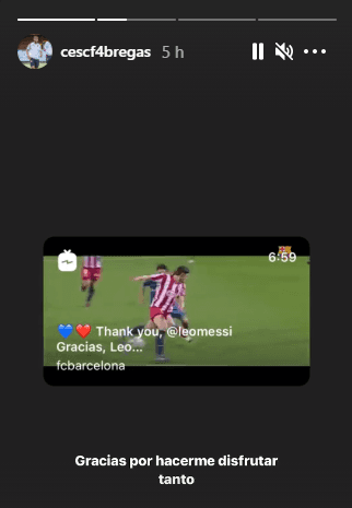 Entre 2011 y 2014, el mediocampista español Cesc Fábregas compartió con el rosarino en la disciplina del elenco catalán, fueron varios los títulos que cosecharon juntos y, con el que el volante le agradeció al sudamericano. con una historia en Instagram, en la que está el video de despedida del Barcelona, así es como el ahora jugador del Mónaco se refirió a GOAT.
