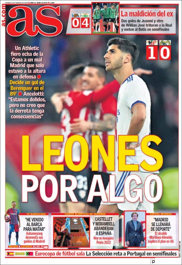 “Leones por algo, El Athletic elimina al Madrid, Rugido final y KO blanco en San Mames”, fueron las portadas de los medios para describir el primer fracaso de la temporada para un Real Madrid que se centrará a partir de ahora en LaLiga y en la UEFA Champions League hasta el mes de mayo.