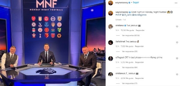 Tras una noche llena de frases que quedarán marcadas en la relación entre quienes fueron compañeros hace unos años en Old Trafford, Wayne Rooney subía a su cuenta de Instagram una publicación donde agradecía el trato recibido en Sky Sports y donde puede vérsele junto a un Jamie Carragher que firmó cada una de las palabras de su colega de mesa. Cristiano comentó la imagen con un claro mensaje.
