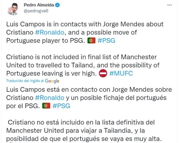 Dicha información parte desde Pedro Almeida, amigo personal de CR7 y de Jorge Mendes en la capital portuguesa. Con el fin de conocer las intenciones de su representando en el Parque de Los Príncipes, Jorge Mendes ya se ha reunido con Luis Campos para analizar un movimiento por el que en Manchester no esperan más de 15 millones de euros. Los problemas no pasan por el sueldo del hijo más famoso de Madeira.