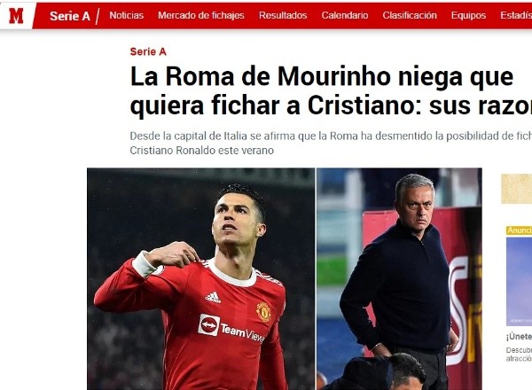 El Corriere dello Sport aseguró que CR7 contaba con una oferta de la Roma para volver a encontrarse con José Mourinho en la capital italiana. Menos de 48 horas después, desde la propia directiva del club aseguran a MARCA que los 23 millones de euros de sueldo y la edad del delantero hacen imposible una operación que no deja de ser un simple rumor de mercado.