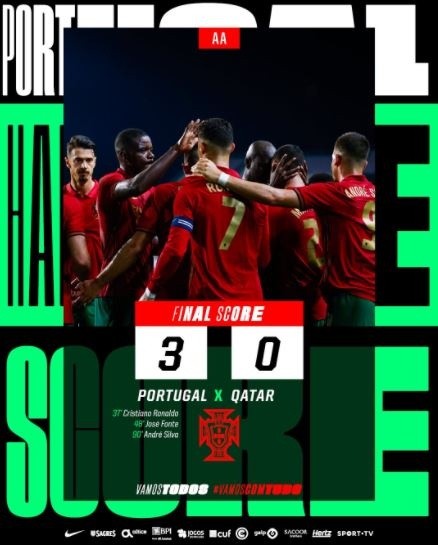 Al minuto 90, André Silva remató con potencia en el área chica de los qataríes y anotó el tercer tanto que le dio cifras concretas al marcador en el duelo preparatorio. Cabe recordar que Portugal está en la segunda casilla del Grupo A de las Eliminatorias, con 13 puntos a uno de Serbia, el líder.