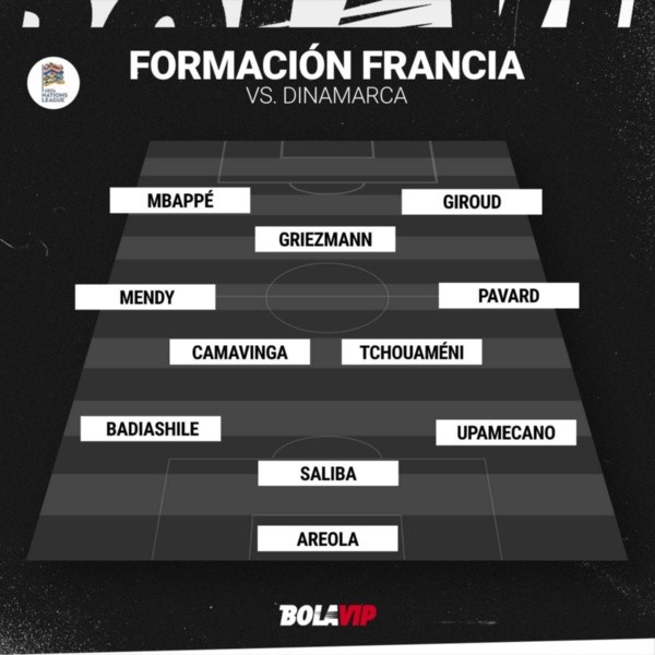Areola; Upamecano, Saliba,Badiashile; Pavard, Tchouameni, Camavinga, Mendy; Griezmann, Giroud, Mbappé.