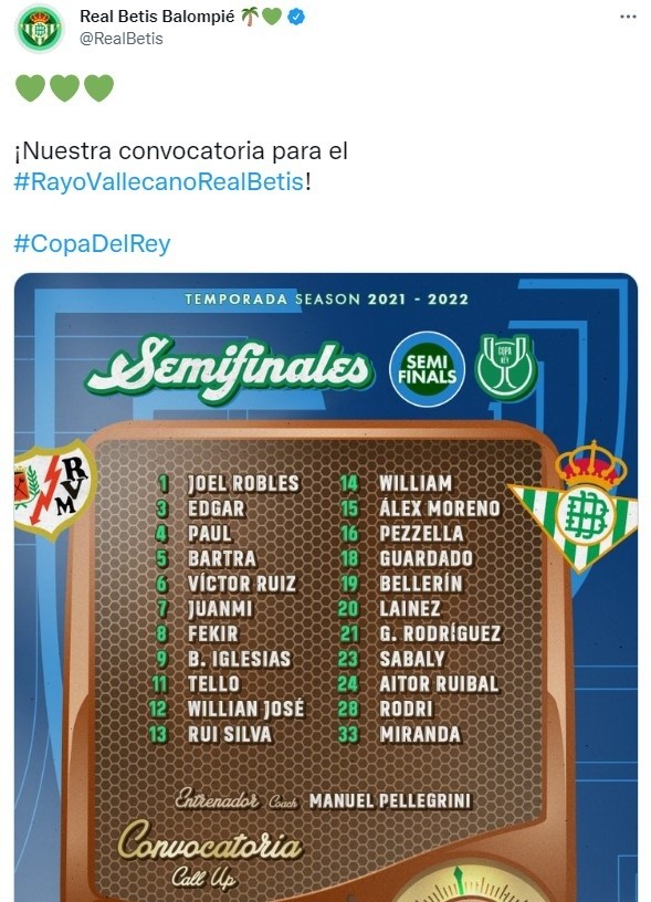Los Béticos, por su parte, clasificaron a la presenteronda del torneo doméstico luego de haberle ganado 4-0 a Real Sociedad. De esta manera, ingresaron en las semis por décima ocasión. Además, ya se proclamaron campeones en las ediciones de 1976-77 y 2004-05. Ahora, el conjunto comandado por el chileno Manuel Pellegrini, que tiene en el plantel a los mexicanos Andrés Guardado y Diego Lainez, losargentinos Germán Pezzella y Guido Rodríguez y el chileno Claudio Bravo, llega tras perder 2-0 con Villarreal en La Liga (3º).