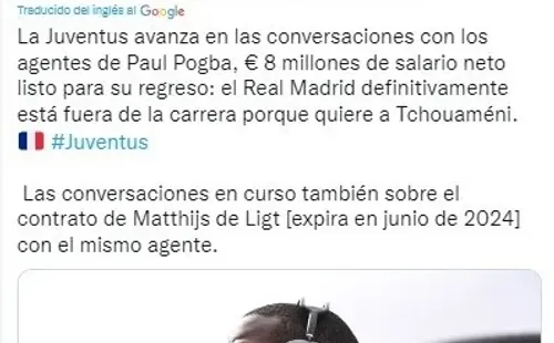 Lo importante de todo es que según el comunicador, el futbolista galo percibirá un sueldo millonario en el equipo de Turín: “la Juventus avanza en las conversaciones con los agentes de Paul Pogba, € 8 millones de salario neto listo para su regreso: el Real Madrid definitivamente está fuera de la carrera porque quiere a Tchouaméni”.