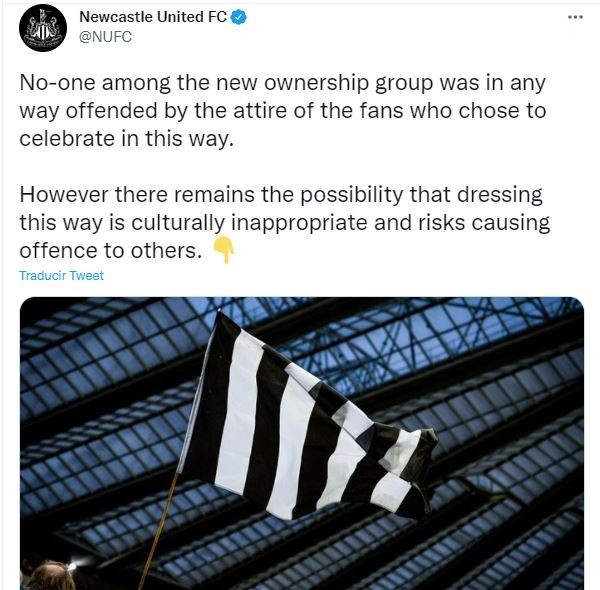 “El Newcastle United pide amablemente a sus aficionados que paren de utilizar las ropas tradicionales árabes o de inspiración de Oriente Medio si no lo hacen de manera habitual. Nadie dentro del fondo se ha ofendido por esta actitud por parte de los fans. Entendemos que ha sido un gesto positivo y para darnos la bienvenida”, señalaba un aparte del comunicado.