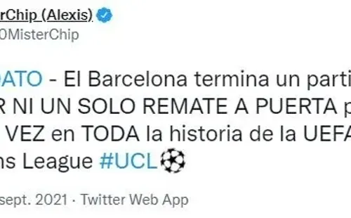 “El Barcelona termina un partido sin realizar ni un solo remate a puerta por primera vez en toda la historia de la Champions League”, rezaba el tweet, hecho por el estadístico ibérico, quien recibió varios comentarios por parte de aficionados luego de pronunciarse en sus redes sociales.