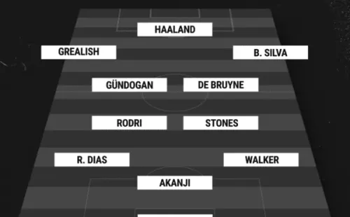 Manchester City sale al Etihad con Ederson Moraes; Kyle Walker, Manuel Akanji, Rúben Dias; John Stones, Rodri; Bernardo Silva, Ilkay Gündogan, Kevin De Bruyne, Jack Grealish; y Erling Haaland en su alineación titular.