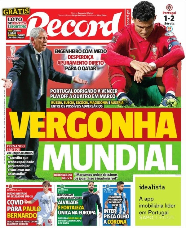 Portugal arde tras una derrota que ha derivado en que la prensa apunte contra toda una selección que vive sus horas más duras de la era Fernando Santos. Las imágenes del cruce entre el DT y Cristiano al final del encuentro reflejan los nervios de una campeona de Europa que está a 90 minutos de quedarse fuera de Qatar 2022.