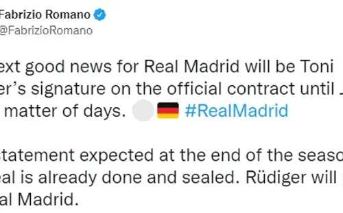 “La próxima buena noticia para el Real Madrid será la firma de Toni Rüdiger en el contrato oficial hasta junio de 2026, cuestión de días.Se espera comunicado del club al final de la temporada, pero el trato ya está hecho y sellado. Rüdiger jugará en el Real Madrid“, expresó en Twitter el italiano.