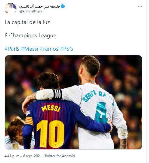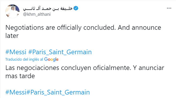 Y es que precisamente, Tamim bin Hamad Al Thani, hermano del actual emir de Qatar Tamim bin Hamad Al Zani, aprovechó su cuenta de Twitter para anunciar que oficialmente ya habían concluido las negociaciones con Lionel Messi y que prontamente se anunciaría su fichaje por el equipo parisino que es dirigido por el argentino Mauricio Pochettino.