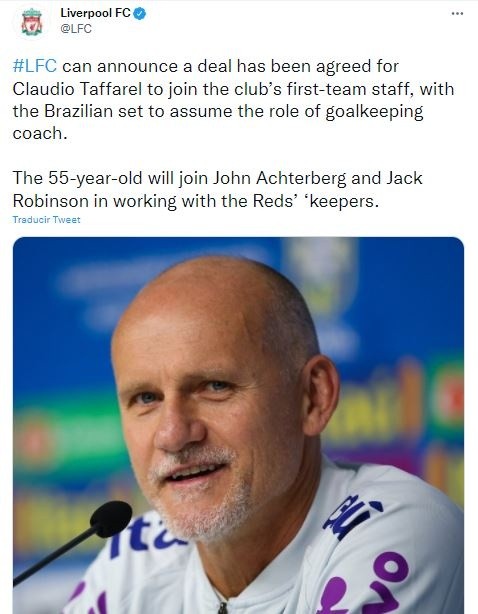 Liverpool le informó a los aficionados y público en general que a partir de la fecha contará con el histórico exguardameta brasileño Cláudio Taffarel como nuevo entrenador de arqueros del club. De esta manera se complementará con su compatriota Alisson Becker.