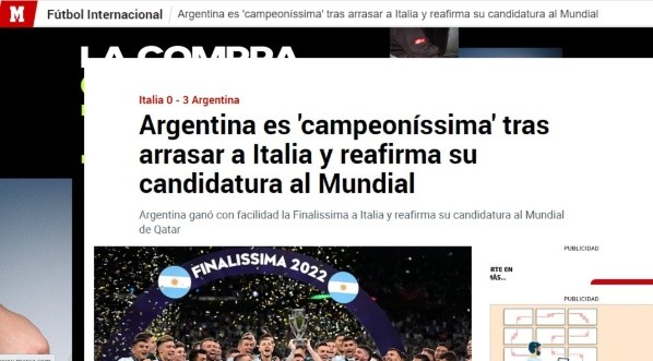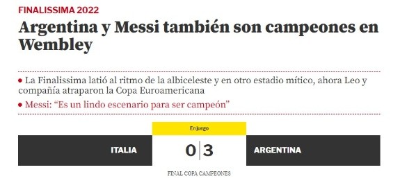 Desde el viejo continente se hacen eco de los visto en Wembley y medios como MARCA, Mundo Deportivo, La Gazzetta dello Sport y el Corriere dello Sport avisan: “Argentina va a por todas en Qatar”. En Europa avisan del nivel de un equipo que impuso su ritmo y fuerza en otro estadio mítico como Wembley para darle su segunda conquista en la mayor a Lionel Andrés Messi.