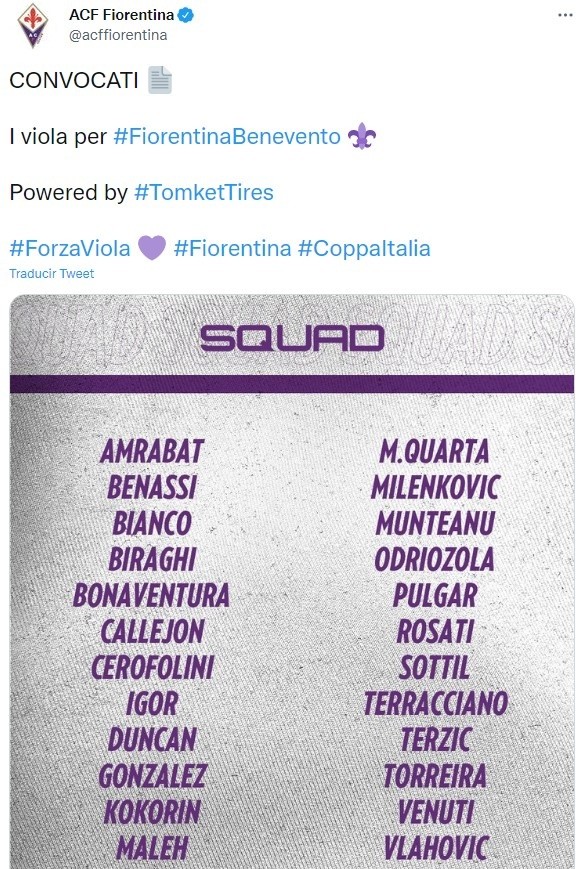 El partidoFiorentina vs. Beneventose llevará a cabo HOY,miércoles 15 de diciembre,en el Estadio Artemio Franchipor los 16vos de final de la Copa Italia.