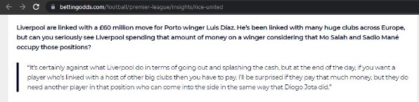 “Me sorprendería que paguen tanto dinero por Luis Díaz, pero necesitan otro jugador en esa posición que pueda entrar al equipo de la misma manera que lo hizo Diogo Jota”, precisamente, el futbolista portugués le ha dado un cambio al ataque de los Reds, ya que no es un titular fijo el brasileño, Roberto Firmino.