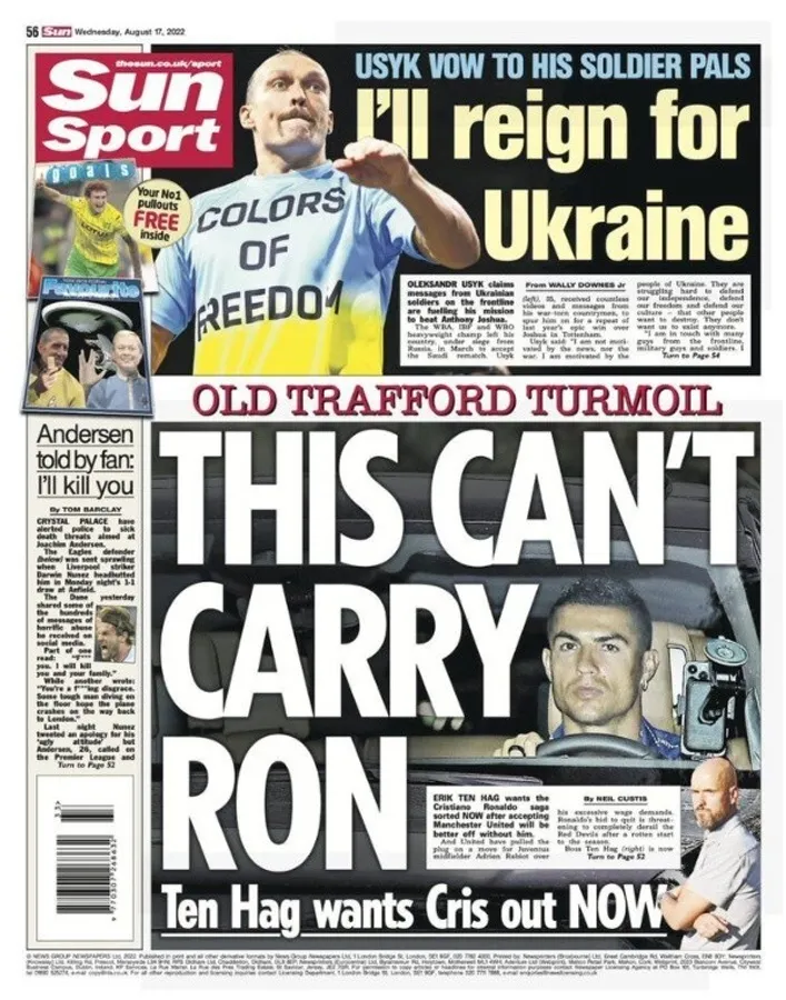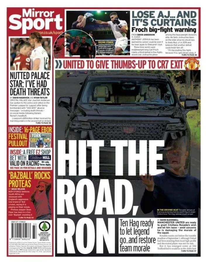 “El United abre la puerta a Cristiano…Ronaldo tendrá su deseo…A la carretera…Esto no puede seguir así”, algunas de las portadas de Sport, The Sun, Daily Star y Daily Express para asegurar que tras dos meses llenos de rumores y pocas palabras oficiales, la era Cristiano Ronaldo en Manchester United tiene los días contados.