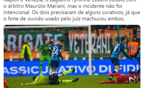 Fue un choque poco habitual, el nigeriano Tyronne Ebuehi se llevó por delante al árbitro del partidoMaurizio Mariani y terminó siendo vendado para poder completar el partido. Lamentablemente no lo pudo hacerlo, sobre el final, el hombre del Venezia vio la tarjeta roja del mismo juez y su equipo cayó 0-2 ante Napoli.
