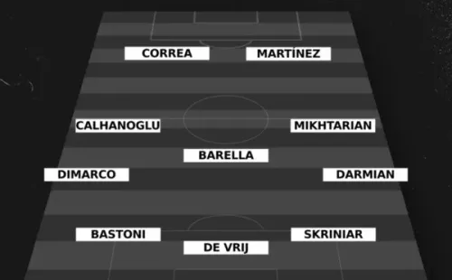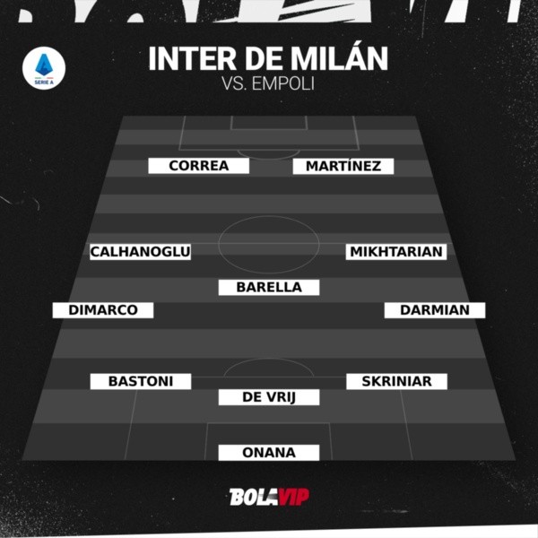 André Onana; Milan Skriniar, Stefan De Vrij, Alessandro Bastoni; Matteo Darmian, Nicolo Barella, Hakan Calhanoglu, Henrikh Mkhitaryan, Federico Dimarco; Joaquín Correa y Lautaro Martinez.