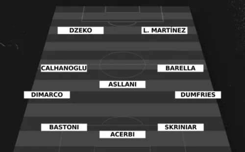 Handanovic; Skriniar, Acerbi, Bastoni, Dumfries, Barella, Assllani, Calhanoglu, Dimarco; Dzeko yL. Martínez.
