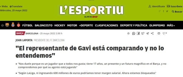 Joan Laporta, contundente en cuanto a la situación del canterano: “Sí, nos duele. No lo entendemos. Gavi es un jugador que nos gusta a todos. Tiene 17 años, un presente y un futuro magnífico en el Barça. No entendemos que su representante esté jugando y comparando. Pienso que la propuesta del club, dentro de nuestros niveles salariales, es más que aceptable”.