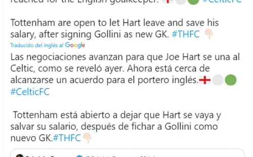 De hecho, el encargado de divulgar la información al respecto, fue el periodista italiano, Frabrizio Romano, quien dijo: “las negociaciones avanzan para que Joe Hart se una al Celtic, como se reveló ayer. Ahora está cerca de alcanzarse un acuerdo para el portero inglés. Tottenham está abierto a dejar que Hart se vaya y salvar su salario, después de fichar a Gollini como nuevo arquero”.
