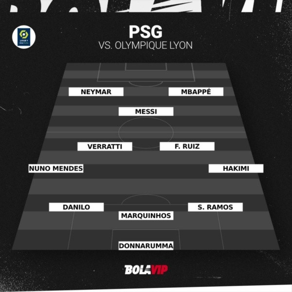 Galtier sigue confiando en su gran tridente, aunque pone algunos cambios en otras zonas del campo. Así, el once titular de PSG para visitar Lyon será con Gianluigi Donnarumma; Sergio Ramos, Marquinhos, Danilo Pereira; Achraf Hakimi, Marco Verratti, Fabián Ruiz, Nuno Mendes; Lionel Messi, Neymar Júnior; y Kylian Mbappé.