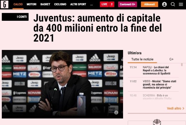 La Gazzetta dello Sport asegura que la familia Agnelli ha pactado un préstamo con el fondo norteamericana Goldman Sachs para que esta invierta 400 millones de euros en el club. La medida llega con el objetivo de solventar los daños sufridos por Juventus en el último tiempo y el deseo de Massimiliano Allegri por mantener a buena parte de la plantilla para lo que viene.
