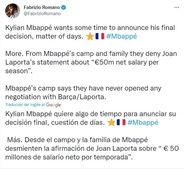 “Kylian Mbappé quiere algo de tiempo para anunciar su decisión final, cuestión de días. Más, Desde el entorno y la familia de Mbappé desmienten la afirmación de Joan Laporta sobre: ‘50 millones de salario neto por temporada’. El entorno de Mbappé dice que nunca ha abierto ninguna negociación con Barça/Laporta”, aseguraba el gurú del mercado de fichajes en sus redes sociales.