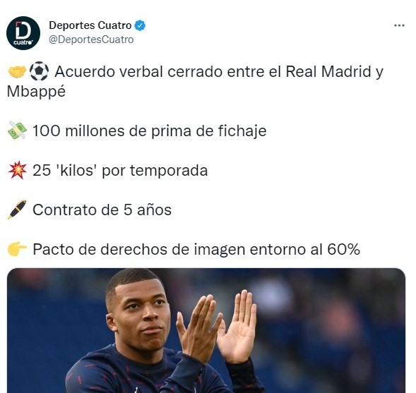 En MARCA aseguran que Kylian será jugador del Real Madrid desde el 1 de julio, así como que su vínculo con el conjunto blanco se encuentra pactado y cerrado de manera verbal con Florentino Pérez. Las cifras son claras en este sentido para Deportes Cuatro, donde desvelan los números de la llegada del galo al Santiago Bernabéu.