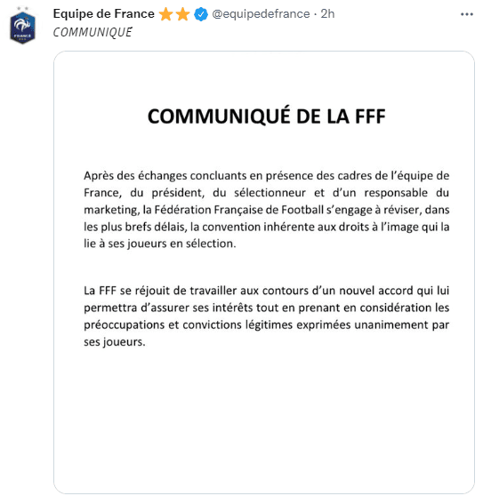 En su cuenta de Twitter, la FFF lanzó un comunicado para informar sobre la situación con el plantel por aquella problemática. Tras una reunión entre sus principales actores, decidieron dar lugar a la revisión de los acuerdos por derechos de imagen.
