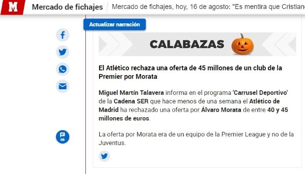 “Me dicen que Atlético de Madrid ha recibido una oferta de 40-45 millones de la Premier League por Álvaro Morata. No fue de Juventus la propuesta”, afirman desde Cadena SER sobre las últimas propuestas que llegan a los despachos Colchoneros por dos delanteros que tal y como dijo el propio Simeone, son intocables: “Todos en el club esperamos que se quedan”.