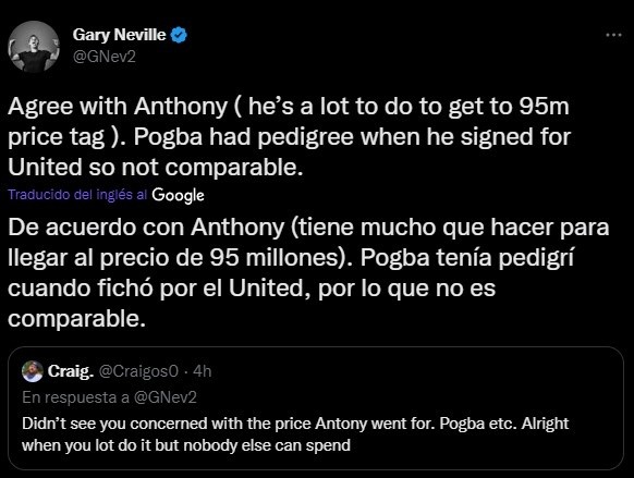 Las críticas a los elevados costos de fichajes en el mercado han llegado por parte de este exjugador de Manchester United, quien, actualmente, trabaja para la cadena Sky Sports. Aunque, en esta oportunidad, recurrió a su cuenta de Twitter para hablar sobre uno de los fichajes más resonados por estas horas en Europa.