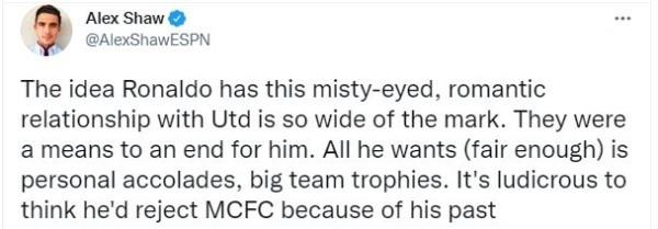 Ante toda esa situación y controversia que hay por la ida de CR7 al equipo de la vereda del frente, Alex Shaw, editor general de ESPN en Inglaterra, entregó su versión respercto al presente del deportista, “la idea de que Ronaldo tenga esta relación romántica con los ojos nublados con Utd está muy lejos de la realidad. Eran un medio para alcanzar un fin para él. Todo lo que quiere (justo) son elogios personales, trofeos de equipos importantes. Es ridículo pensar que rechazaría MCFC por su pasado”.