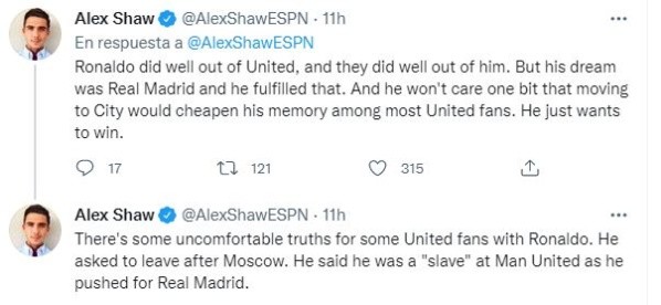 Además, dentro de su hilo de tweets reveló un secretó que pocos conocían sobre lo que fue su paso por Manchester United: “hay algunas verdades incómodas para algunos fanáticos del United con Ronaldo. Pidió irse después de Moscú. Dijo que era un “esclavo” en el Manchester United mientras empujaba al Real Madrid”.